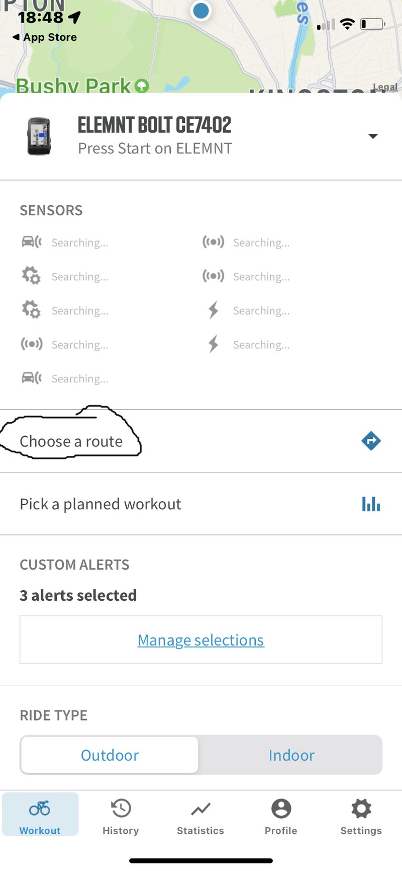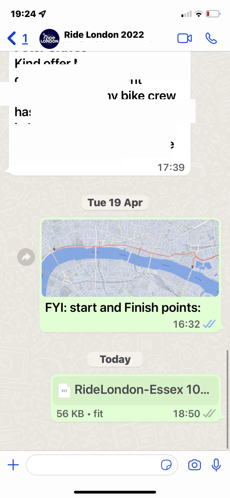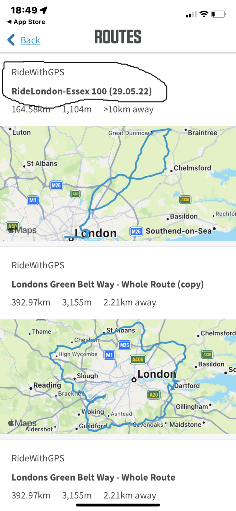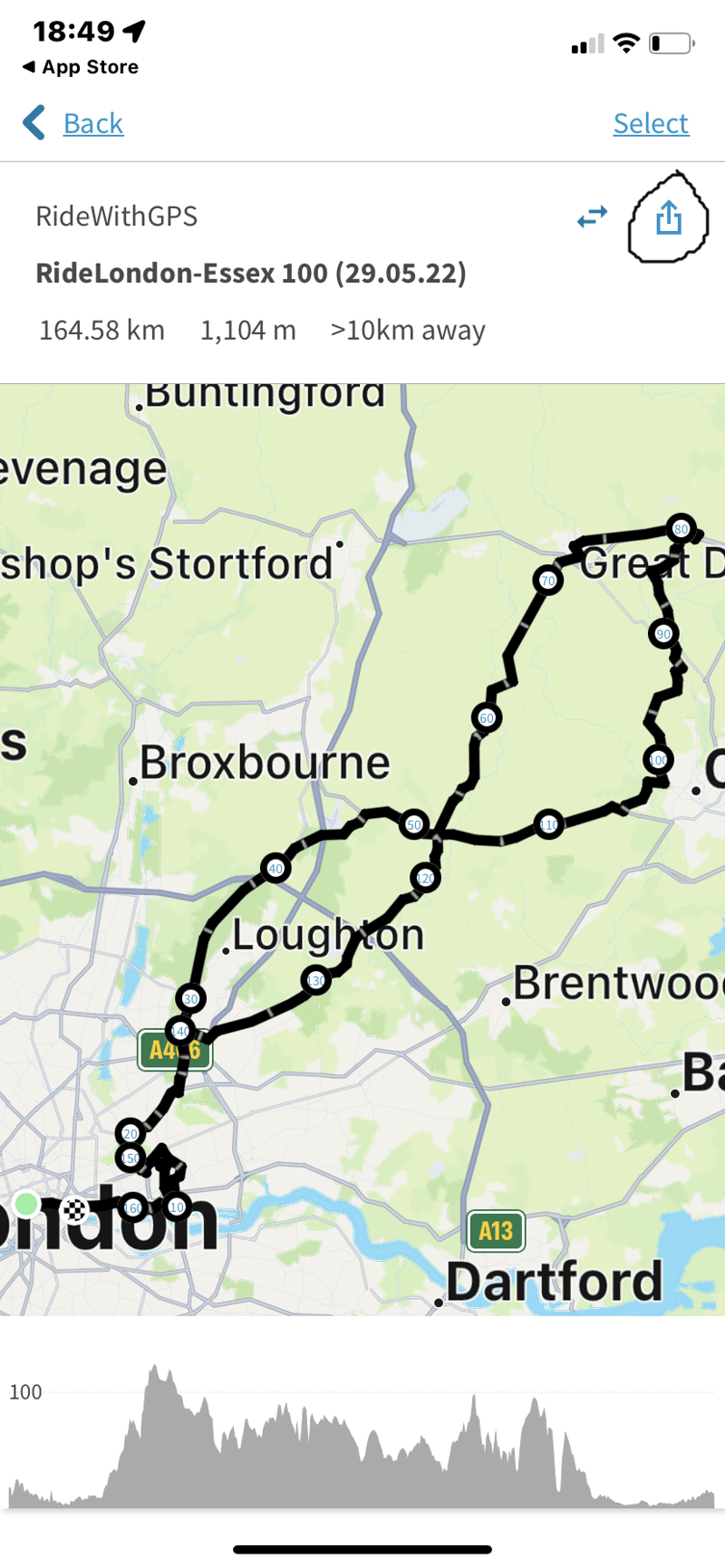 If you update your ELEMNT app you should now be able to send an existing route to lots of other people via various apps and methods. Here is the screenflow from my Wahoo Bolt 2 where I find this year’s new Ride London Route, already synced from RwGPS. Next, I push it to the WhatsApp group we have just for those of us going on the Ride London. You can send it to other places too of course…AirDrop could be an interesting option if you all have iPhones present at the start of a ride.