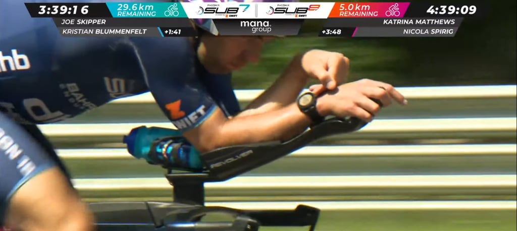 The women will both go Sub8 and probably by a considerable margin. Katrina Matthews is an awesome long-distance time trialist in her own right, so with some fast bikers pulling here along, she should be able to hold some massive bike speeds and gain a significant lead before the run, her 40.75kph target is ‘easy’ for her (edit: the ladies did over 46kph and Joe did 55kph). But then Ms Spirig is always going to gain ground on the run, at least for the first half of it. But how much? She will have a much bigger time gap to make up than normal.