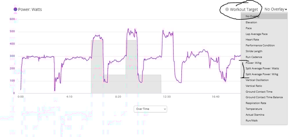 Once uploaded to the Garmin Connect app or web platform, you will get some nice insights into your power. For example, this chart shows actual vs. target watts and some split and w/kg metrics.