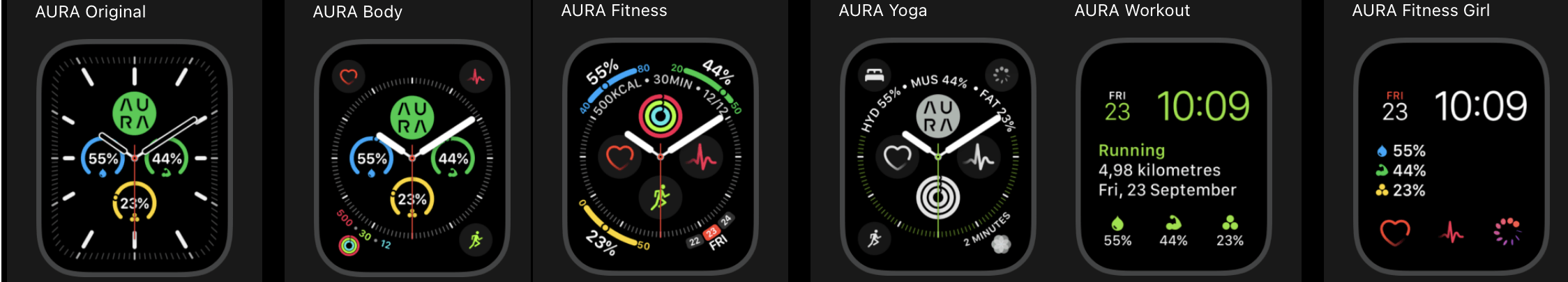 Aura also gives you the option to set their watch face and that makes use of the complications which you are free to use on any Apple Watch watchface. The complications available are the latest results for water, muscle and fat.