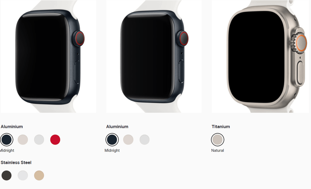 The range of case colours has been reduced from the prior generation with a maximum of 3 colours per model plus Product RED for the Series 8 aluminium.