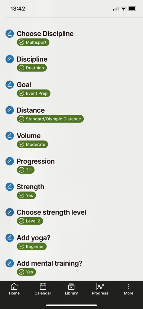 The training plan creation is fairly impressive and flexible. I liked how I could create a duathlon plan for a given distance and set my easier week to be every fourth week, the bonus being the addition of strength, flexibility and mental training.