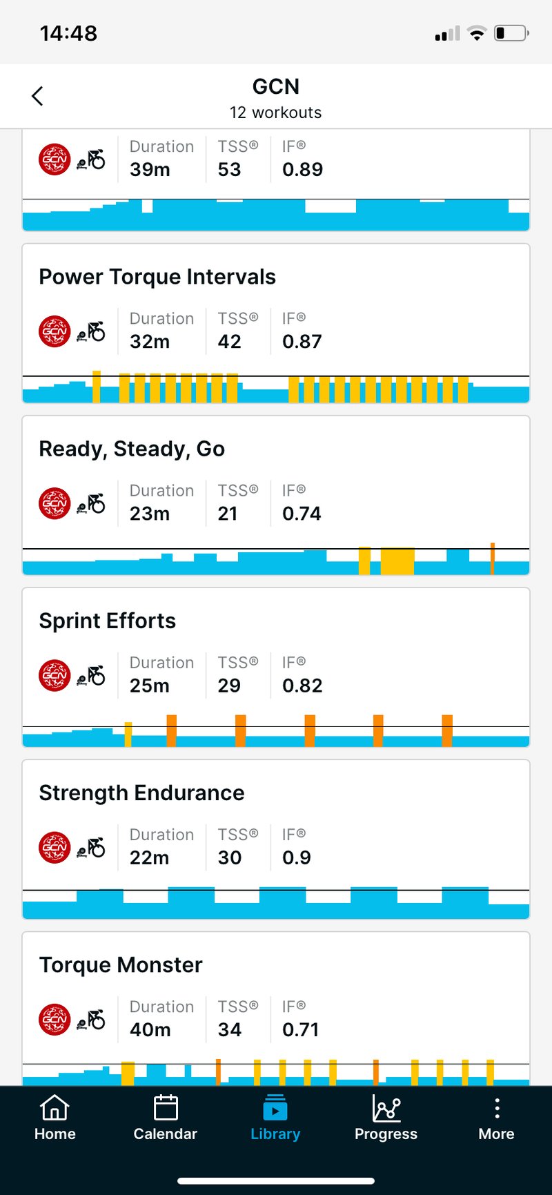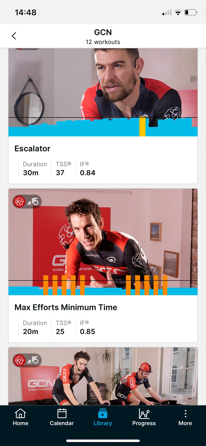 Most of you will know the GCN YouTube channel, an often entertaining and sometimes enlightening place to visit for all things 2-wheel-related. The workouts that underly the sessions are led by the GCN team tend to be somewhat kinder than those in Sufferfest. The broad thrust of the app interface is the same though ie video content overlaying a smart interval workout with various ways to display the phases of the workout and your live performance.