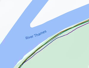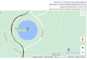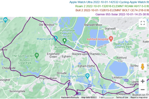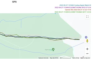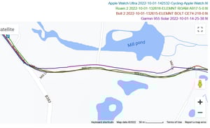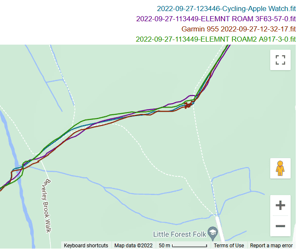 The results were not exciting. The Forerunner 955 was slightly worse, but I had that set to work less accurately with GPS-only to maximise battery life. Roam 2 and the Apple Watch Ultra used dual-band and performed indistinguishably from each other. They were both a little bit better than the old Roam, but to the point where you had to look hard to see the difference. Check out these images to spot the tiny differences in some of these tree-lined sections. The final picture shows a roundabout/circle with no trees, and the GPS reception there is excellent…just as it is on roads 99% of the time.