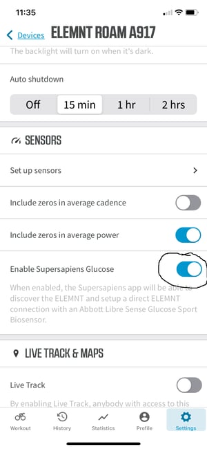 Supersapiens are constrained by the unusual technical characteristics of the Abbot glucose sensor at the core of the Supersapiens platform. The sensor isn’t a conventional ANT+ or BLE sensor. If you have a Supersapiens energy band that must first be removed from the Supersapiens app and then linked to the Roam 2, switch over to the Elemnt app and change the Roam 2 setting to enable Supersapiens on it, and all should be good.