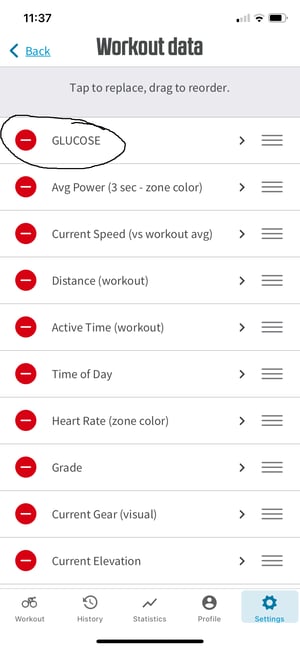 I couldn’t manually find the Glucose metric in any of the lists of metrics in the ELEMNT app, although it did automatically appear on the Workout Data page. I’ve been afraid to remove it in case I couldn’t find it and add it again!