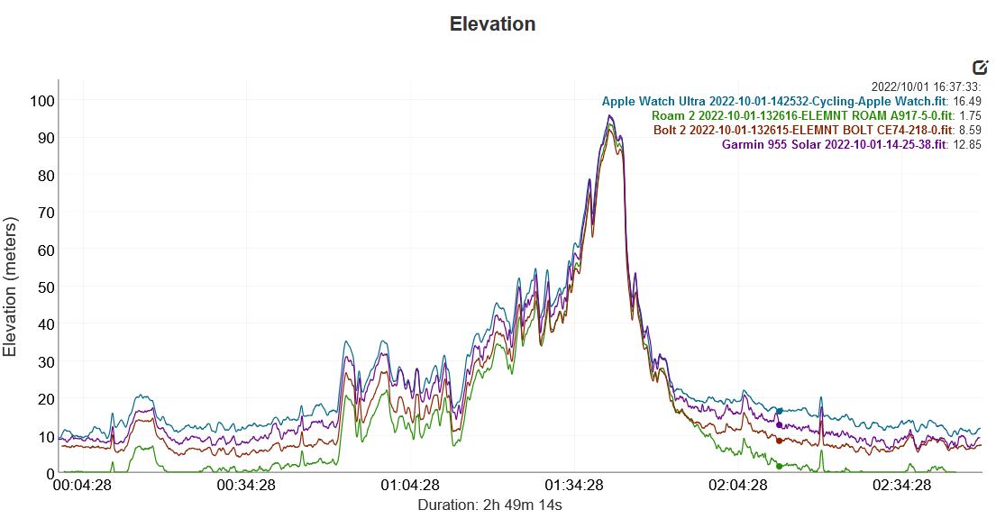 Roam 2’s elevation accuracy is probably OK. But this chart is strange because it shows me starting and finishing at sea level (I’m at about 12m). However, that 12m gap to the ‘correct’ elevation disappears as I go toward the hill and reappears afterwards. Very strange.