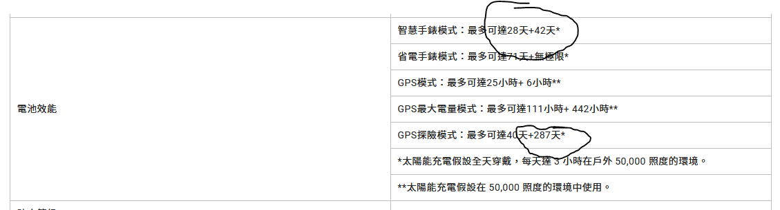 I’ve copied the specs in Taiwanese (ahem) and maybe there is a maximum battery life of 287 days? It says elsewhere that there are 31 hours of battery life in GPS mode 2. How that ties in with the chart below, I’ve no idea.