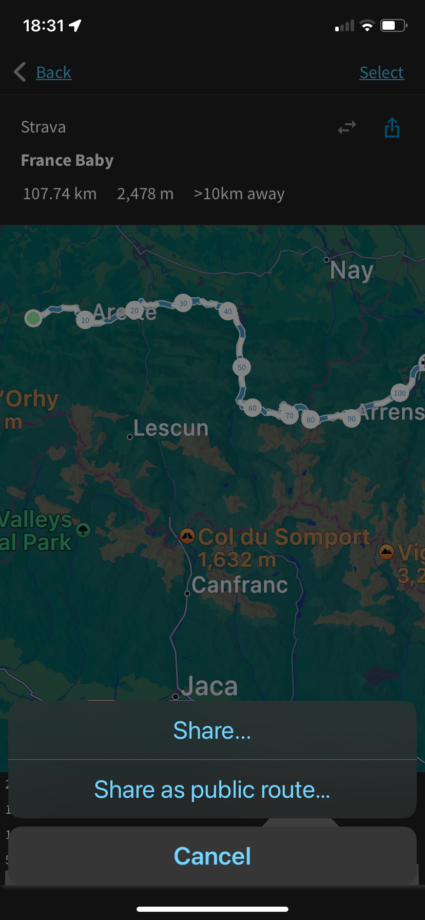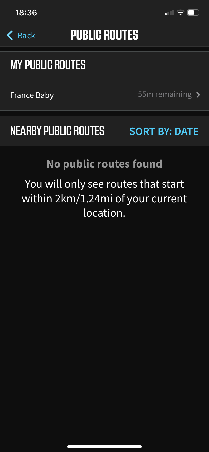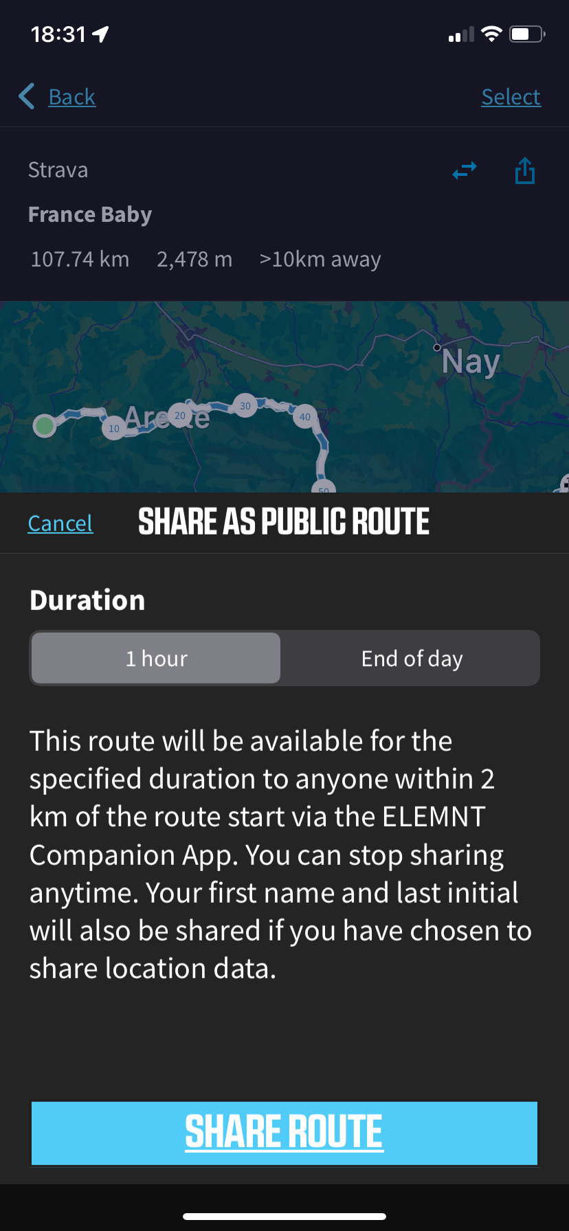 You can publically share a route on your smartphone’s Elemnt app. Thus at the start of any kind of organised event – formal or informal – anyone else within 2km from the start of the route will see the route in their Elemnt app and can select it in the same way as any other route.
