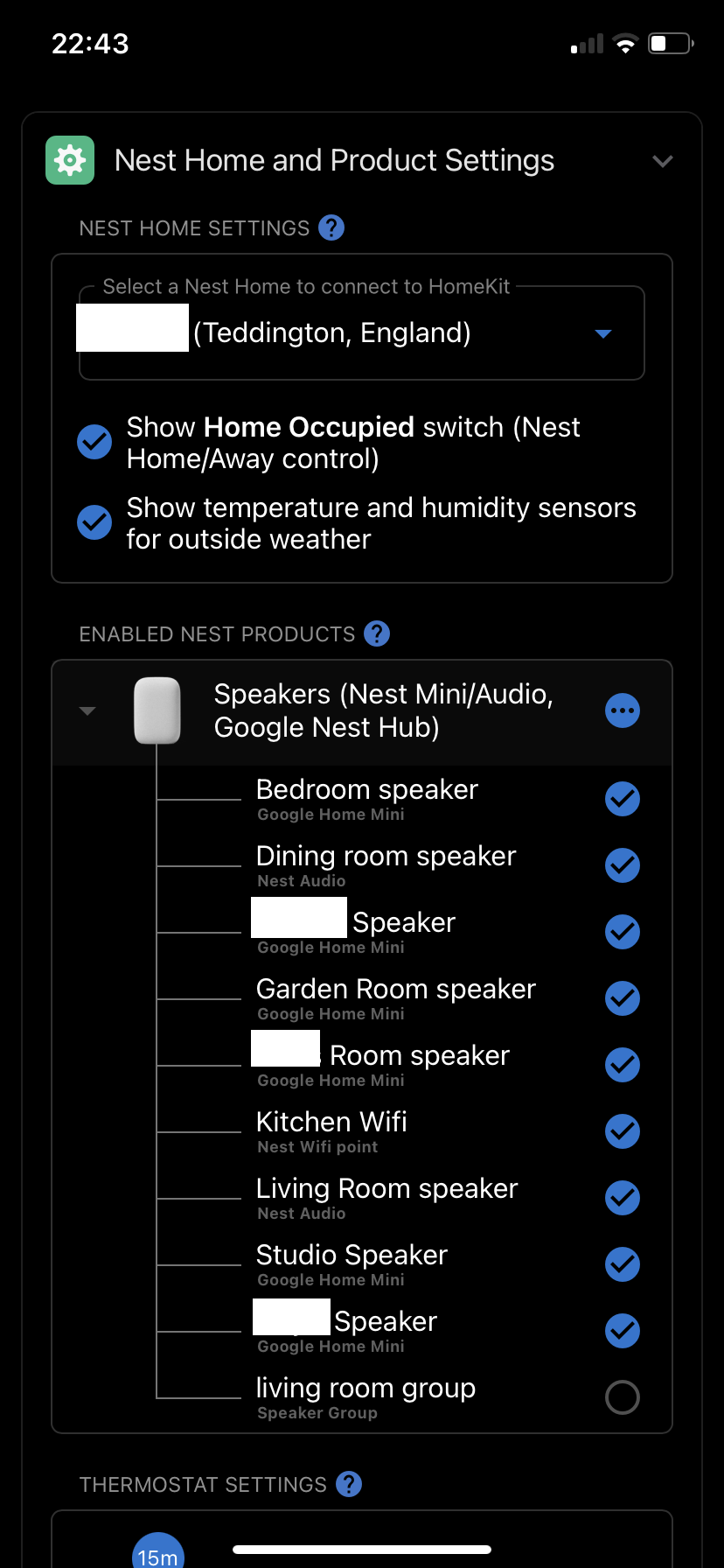 After you link your Nest account the Starling app will understand your Home and all the Nest gear in it but not which room it belongs to. At this stage, all you have to do is uncheck any Nest items that you want to exclude from Apple Home. Each Nest item can have multiple abilities but you don’t have to worry about that yet just either include or exclude them. Like this…