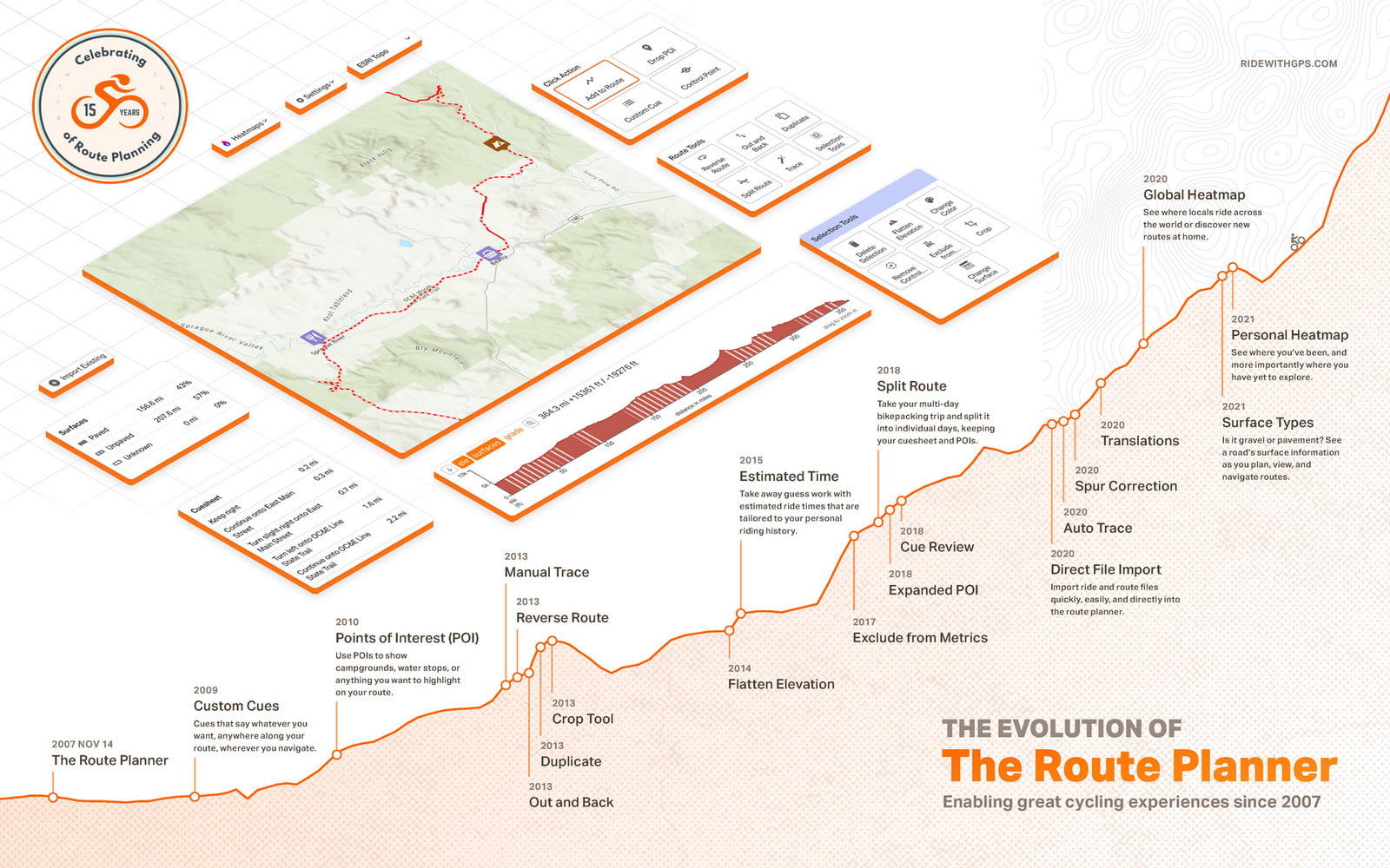 The link and image below do warrant a closer look. Readers (and competitor companies to RwGPS) can see just how and when all the new RwGPS features were added. The level of complexity is immense and obviously time-consuming. If you are a competitor platform this image offers some pause-for-thought on the difficulties that lie ahead for your software development team. Perhaps instead it’s best to focus on the other things that will make you money and integrate with the established platforms…just sayin’.