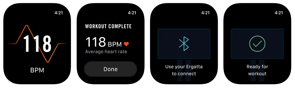 After the initial pairing, Apple Watch connects with the rower via Bluetooth with just a tap before workouts. Heart rate metrics are displayed live on both an Apple Watch Ergatta app and on the rower, with the watch providing average heart rate data after finishing.