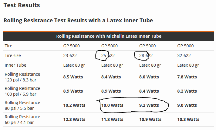 To determine the best tyre pressure, I used the Silca SPPC form, which recommended an inflation level for me of about 80psi. Using 25mm tyres at this pressure, you can save an additional watt of rolling resistance as shown on the following chart
