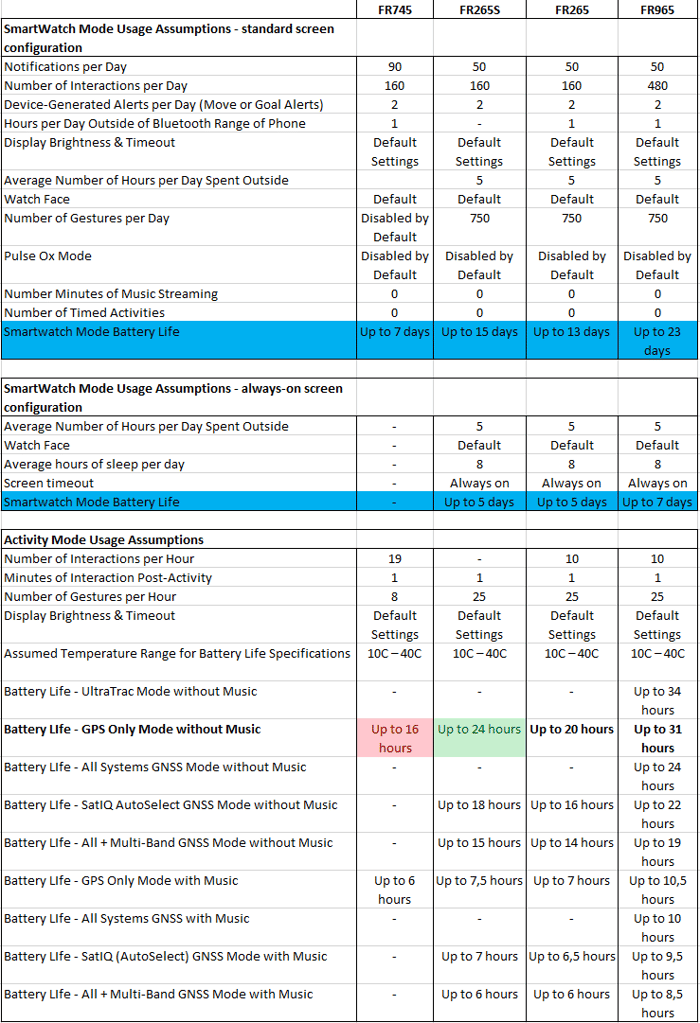 Many thanks to reader @KHP for this comprehensive comparison of battery life expectations for some of the key Garmin triathlon-ready watches.