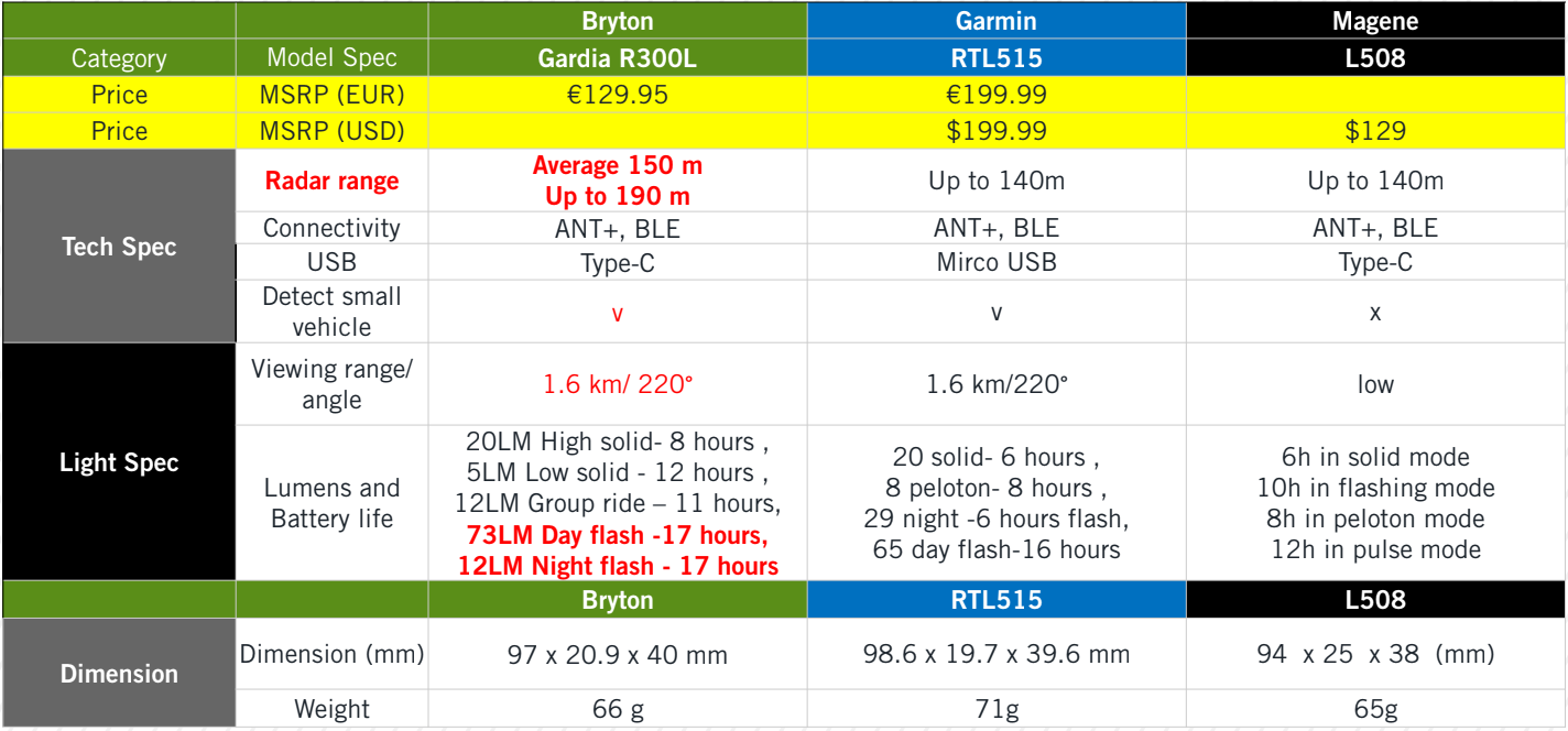 The headline specs shown here are the key ones to consider, and you can see that Bryton pretty much nails it in all respects by either beating or matching what the competitors offer.
