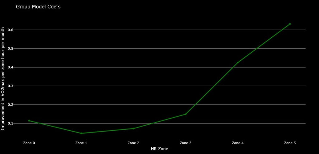 The chart to the right (via ace-coach and researcher Alan Couzens) clearly shows that an hour spent at Zone 4 or 5 intensity will increase your VO2max far more than an hour of endurance exercise. However, frequent high-intensity workouts are unsustainable as they accumulate too much fatigue.
