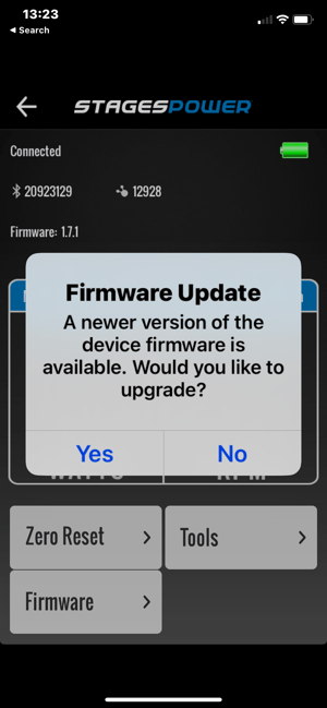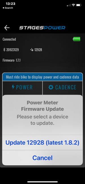 The Stages Power app (not the Stages cycling app) is the one you need to install just to check if you have the latest firmware.