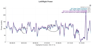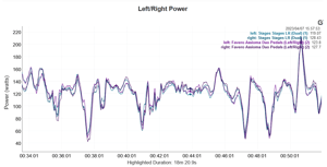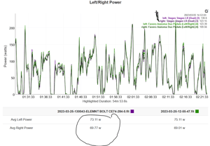 Both left side powers are lower than right and I would expect that, however, Stages was consistently lower than Assioma