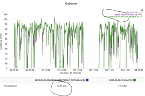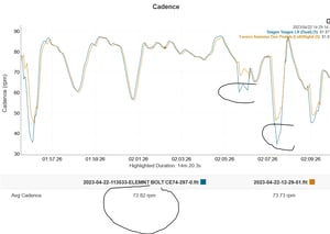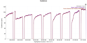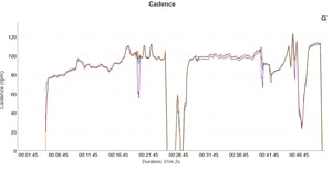 This time the cadences were mostly in agreement, other than with the Kickr which determines cadence differently.