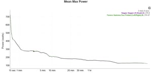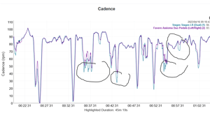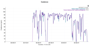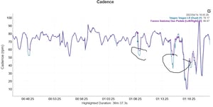 The overall CP curves look pretty close although the Stages is 1% or so lower. But check out the cadence and the Stages are often notably lower than Assioma.