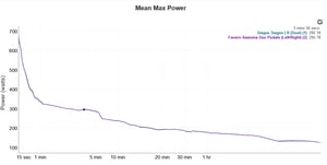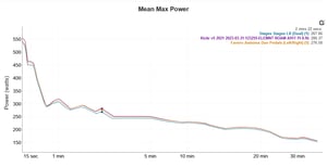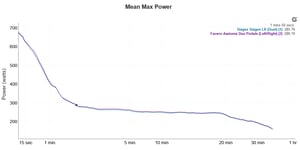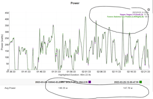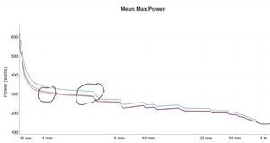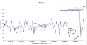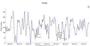 I performed a calibration at the start and at 20 minutes. The second calibration seemed to change the Kickr numbers relative to the other two, meaning that the Mean/Max curve becomes meaningless. I also spotted 6 partial dropouts (circled, below) from the Stages which are clearly ‘wrong’.