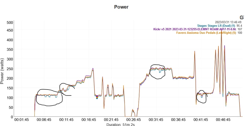 I tested the Stages against Asioma Duo and against both a Wahoo Kickr V3 (2017) and Kickr V5 (2021). I used dcr’s analyzer tool for the charts.