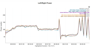 this was a repeat of an earlier test just to confirm that I had the gyroscope off and the latest firmware. It seems that the left crank may be the one that occasionally underreports power when cadence is underreported. Other than that it matched Assioma nearly perfectly.