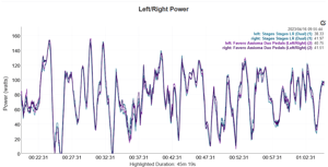 Assioma was reading slightly higher here and Stages left power was a tad lower than what might be correct. A similar picture to the earlier rides but the difference between the two devices is something like 1%