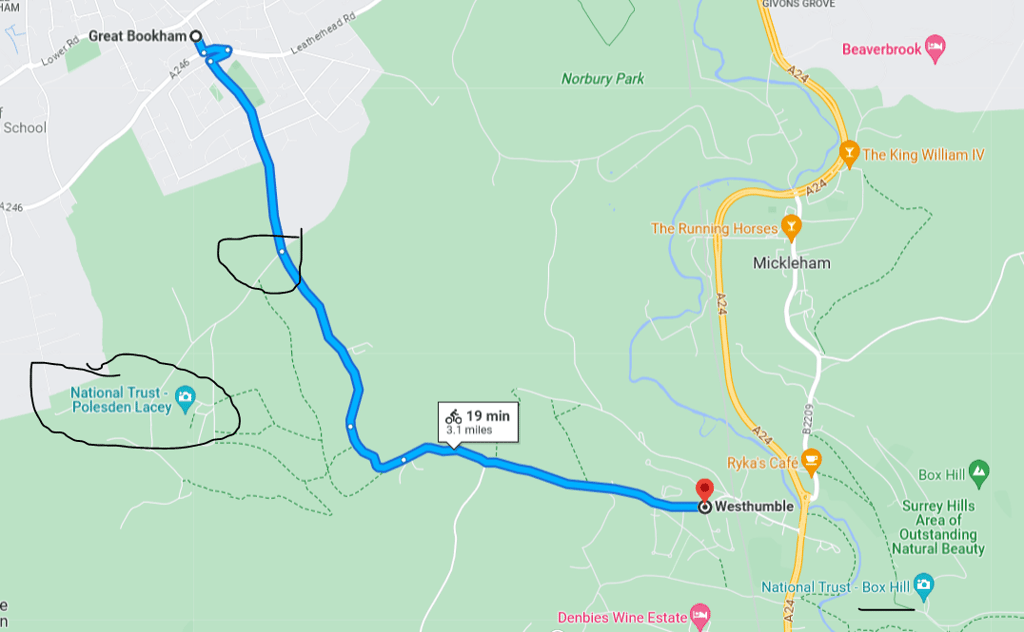 The next issue that does matter is how the algorithm predicts the hill ahead when the hill negotiates a junction. This is best illustrated by the following map when I went uphill before the descent towards Westhumble (Box Hill). The circled part of the road is the uphill junction where Garmin goes straight on and follows the ‘correct’ blue route that every cyclist takes. In contrast, Wahoo is routed to stay on the main road (white) which turns right and heads to Polesden Lacey, a notable tourist attraction where most cars would go.