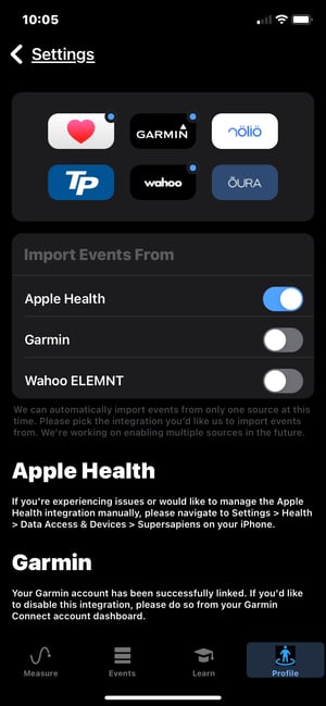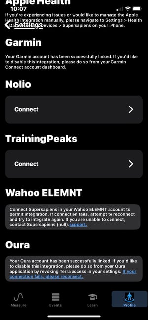 Some other Supersapiens data comes from Apple Health but that’s not the case with Oura or Ultrahuman. Oura requires a direct link between the two platforms and these screenshots illustrate how you achieve that from the Supersapiens app.
