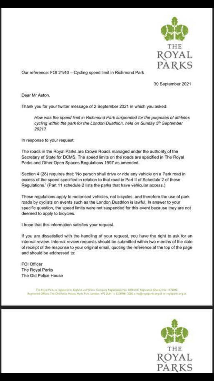Richmond Park (one of the UK’s Royal Parks) used to be thought to be an exception as there was widely believed to be a valid bye-law that placed an additional requirement on cyclists to adhere to the motorised speed limit. However, the Park Authority rather cleverly wrote to someone (image above) and confirmed the speed limit does not apply to cyclists. Indeed the only speed laws that do apply to cyclists in the UK are based on ancient legislation around “wanton and furious cycling” which is probably equivalent to reckless/negligent/dangerous cycling (which doesn’t exist as a law). So there we have it, if you keep your cool and don’t get angry you can go as fast as you like anywhere.