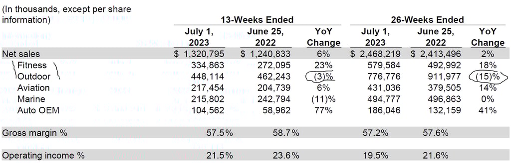 The division that sells Fenix 7, Epix 2, Instinct 2 and handhelds is called OUTDOOR and this quarter has shown a continuing slide in sales (3%) which, when combined with the previous quarter’s dramatic 27% crash, gives a half-year decline of 15%.