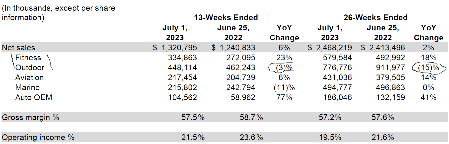 Outdoor: Revenue from the outdoor segment decreased 3% in the second quarter as growth in adventure watches was more than offset by declines in other categories. Gross and operating margins were 63% and 31%, respectively,