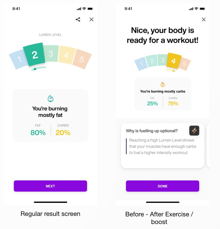 Lumen’s bar widget displays your current level, along with the percentage of fat and carb burned, based on CO2 data.