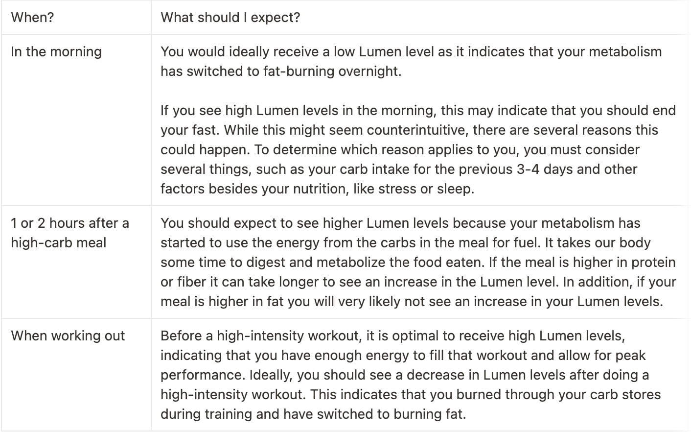 There are no optimal timings for high and low Lumen levels which will naturally vary throughout the day depending on your diet and activity levels. However, you should broadly expect to see this: