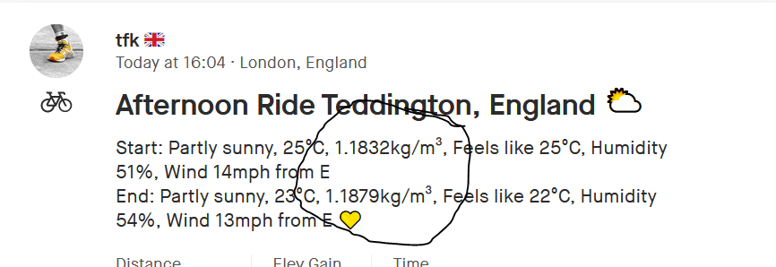 I exchange the occasional email with Scott F the owner of Klimat and suggested to him that he should add air density. Bottom line: he just did, as the image above shows an example of my loops today. Apparently, air density is relatively easy to calculate and I’m surprised that the mainstream cycling platforms don’t have this information (or maybe I’ve missed it…obviously pro tools like BBS have it).