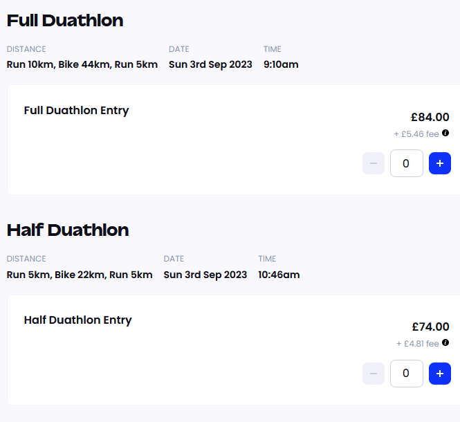 - Half Duathlon: 5km Run – 22km Bike – 5km Run