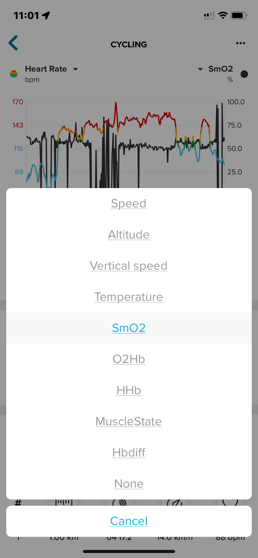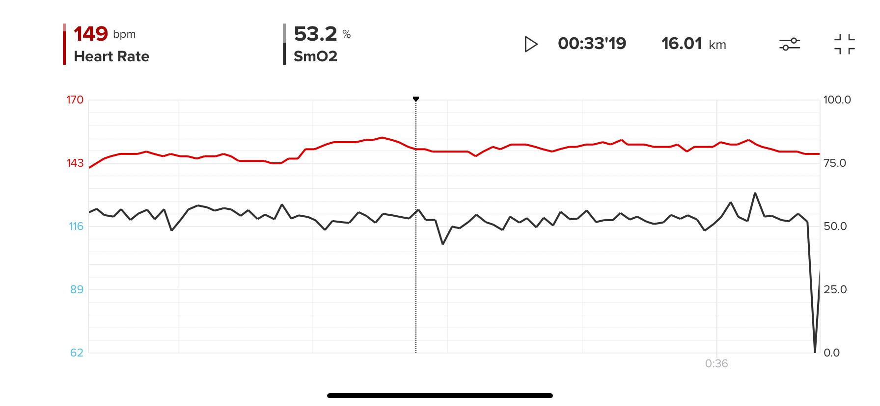 3. Chart – This seems to be a 30-second plot of SmO2, accompanied by the live SmO2 value.