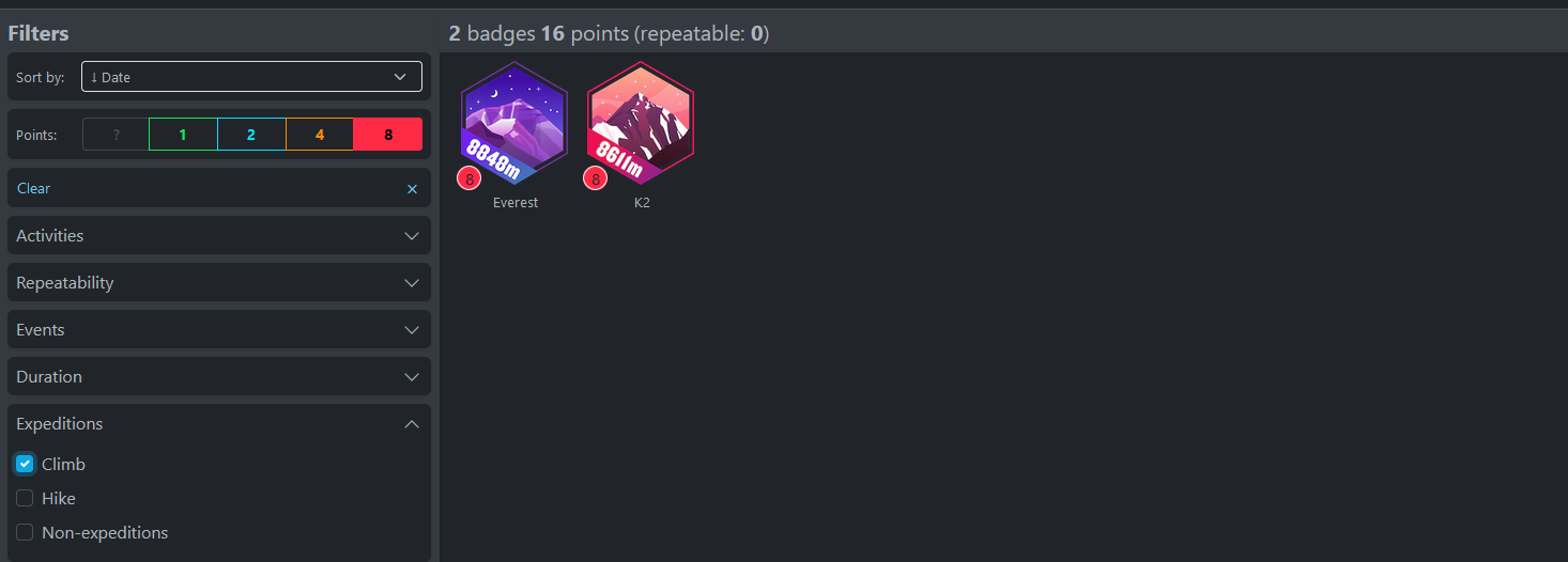 Garwin’s Garmin Badges Database is highly interactive and lets you discover new challenges from the 1,000 or so Garmin badges using multiple user-friendly filters, such as activity type, repeatability, duration, event type and many more: