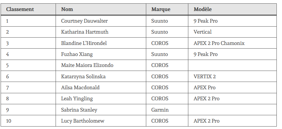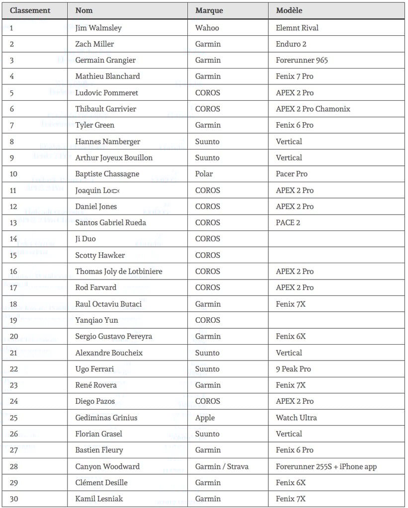 Props to Jerome at Montre Cardio GPS for the primary research for this data. He analysed photos, Strava uploads, and I think was also present during the race itself to come up with this table of tech.