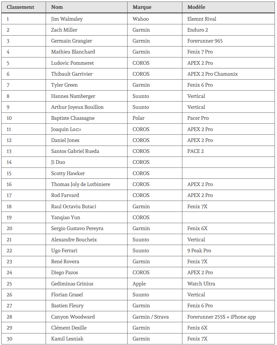 Props to Jerome at Montre Cardio GPS for the primary research for this data. He analysed photos, Strava uploads, and I think was also present during the race itself to come up with this table of tech.