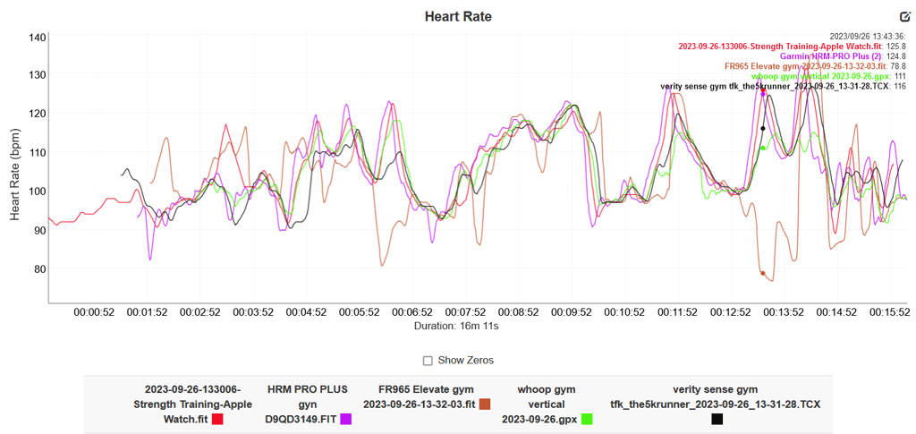 This is a quick upper-body workout focussed on exercises with a lot of arm/wrist movement. As you can see there is no agreed correct track but the broad trend is discernable. Other than the Garmin fails on several occasions, the rest all seem similar enough. Note: Once again, there is little point in measuring heart rate for strength workouts as the heart rate is NOT a valid way to calculate strength training load. Only WHOOP adds accelerometer movements in its app to account for other factors and thus get a better handle on training load.