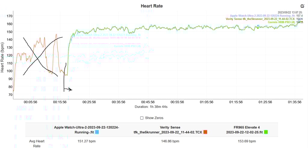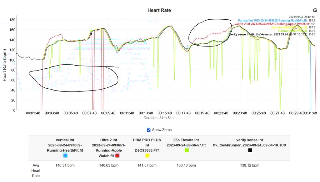I wasn’t feeling too great when I ran these varying-intensity efforts. It didn’t really work out from an execution perspective. It didn’t work out either for ULTRA 2 and HRM PRO PLUS (FR935) both showing dropouts albeit not too concerning for the Ultra. What was more concerning for Ultra 2 was the circled section halfway through where it overestimated my efforts too quickly