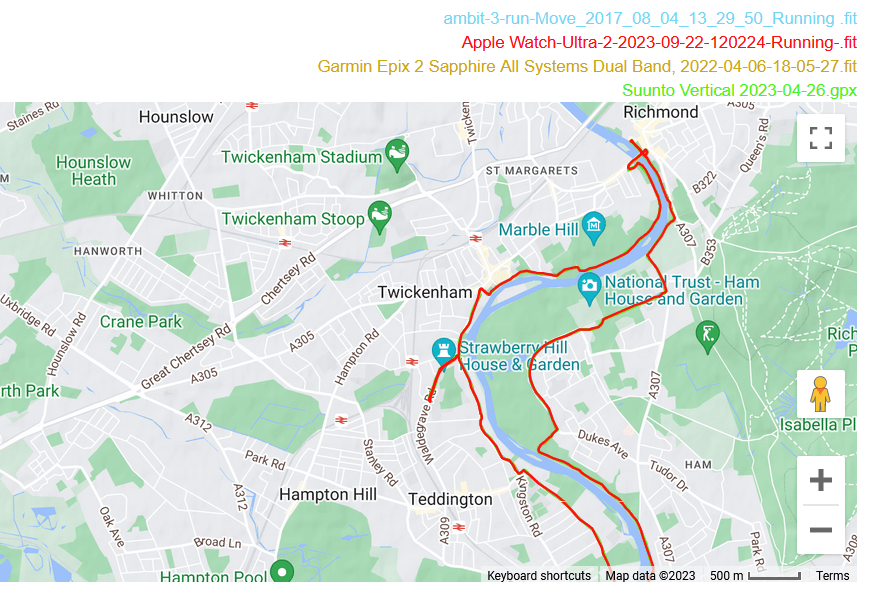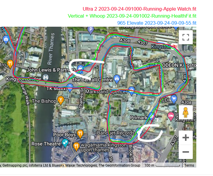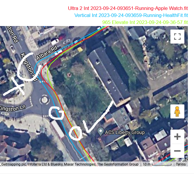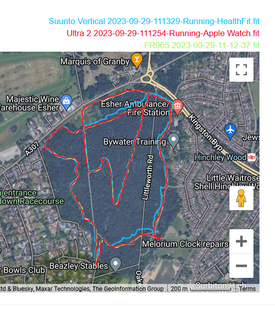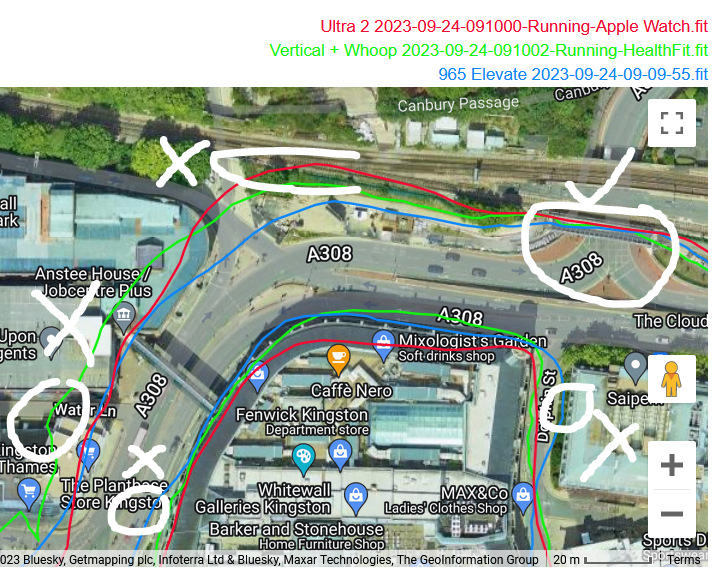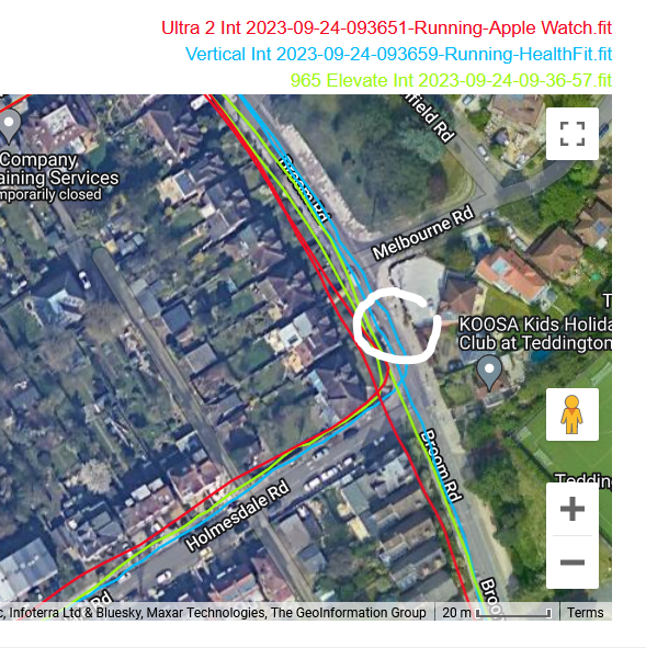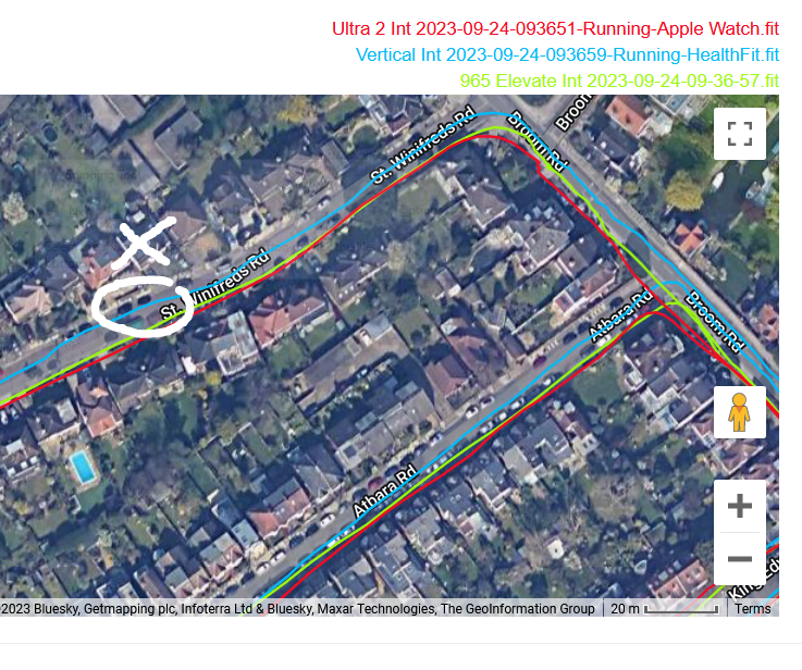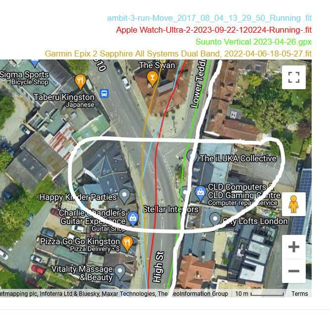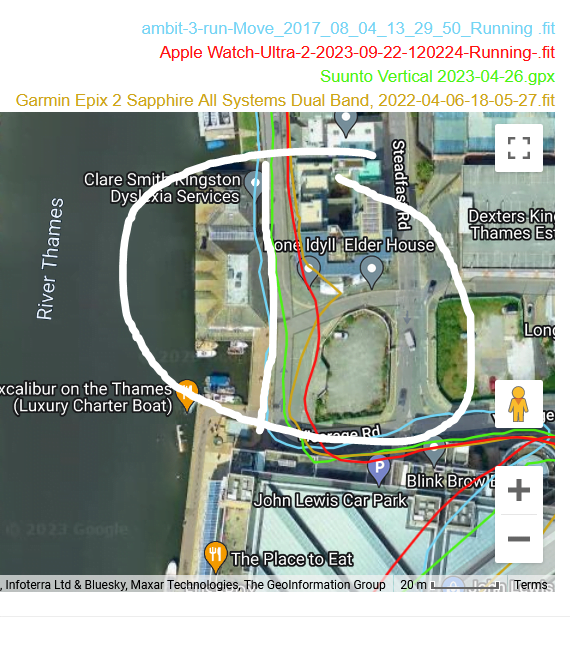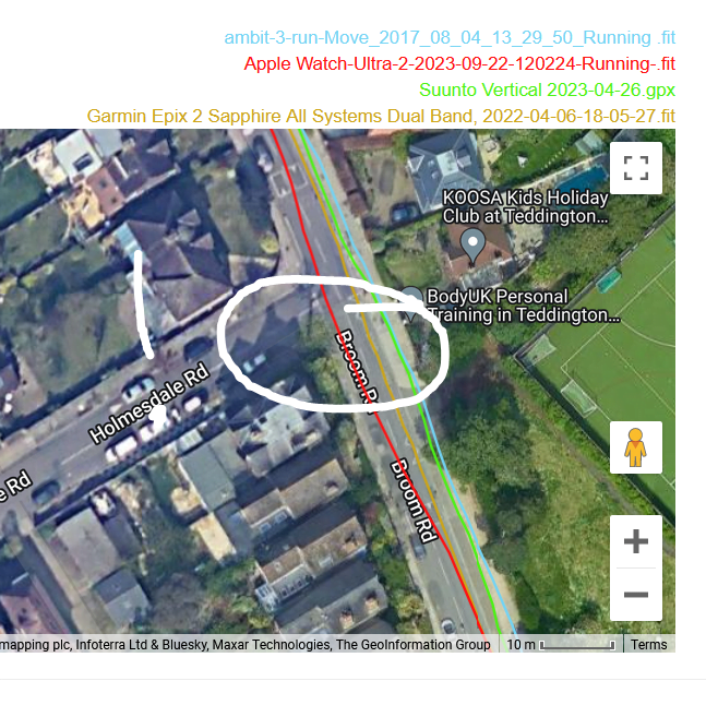 That said, these tracks are reasonably accurate. If you look closely you have a Eureka moment when you discover one watch nails it only then to mess up a few 10s of metres later. The reality is that none of these watches properly use dual-frequency signals to eliminate incorrect readings. The technology should be able to do that as of today but more improvement is needed.