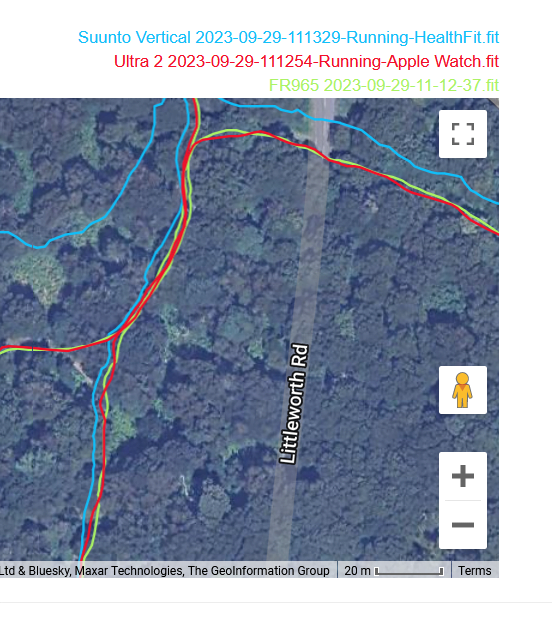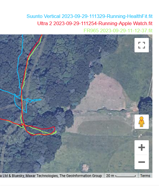 This was a challenging GPS test with LOTS of tree cover. Watch ULTRA 2 and Forerunner 965 were mostly inseparable in terms of quality; perhaps FR965 edged it a bit. Suunto Vertical was strangely inaccurate to an unacceptable level often more than 5m out.