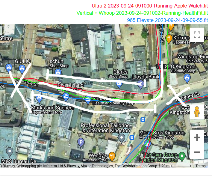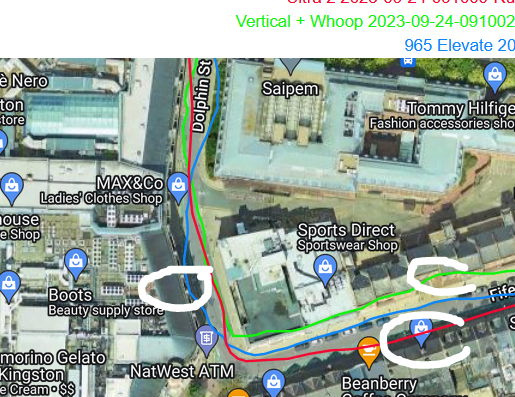 Here are three areas where the ULTRA 2 did not perform correctly. The first two are next to high buildings. Suunto Vertical is notably superior here. The third image depicts a WTF moment that followed several similar WTF moments, I’ve no idea why ULTRA 2 had me running about 5m away on the wrong side of the road especially when 500m later in the same conditions it was perfectly fine.