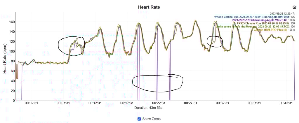 I wasn’t feeling too great when I ran these varying-intensity efforts. It didn’t really work out from an execution perspective. It didn’t work out either for ULTRA 2 and HRM PRO PLUS (FR935) both showing dropouts albeit not too concerning for the Ultra. What was more concerning for Ultra 2 was the circled section halfway through where it overestimated my efforts too quickly