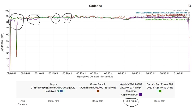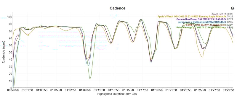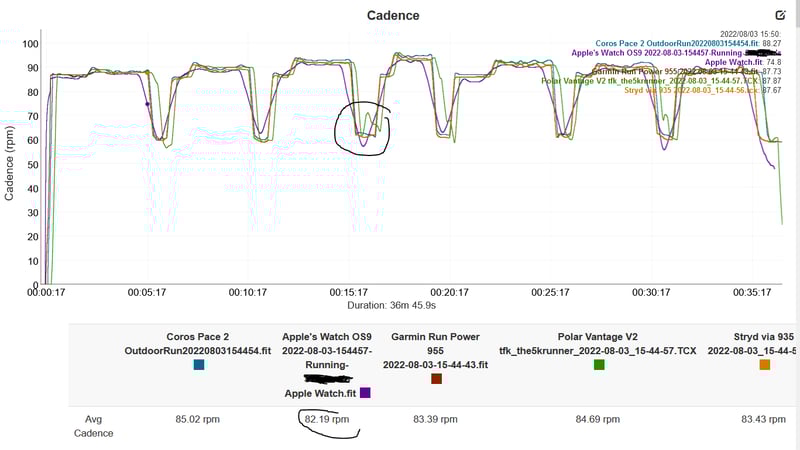 It could be my Suunto watch though. Suunto is notorious for dropping all readings for one second (shows 0 in the .FIT file) and my 9 Baro Titanium can get sluggish at times, even during the run. Maybe I should get a Garmin.