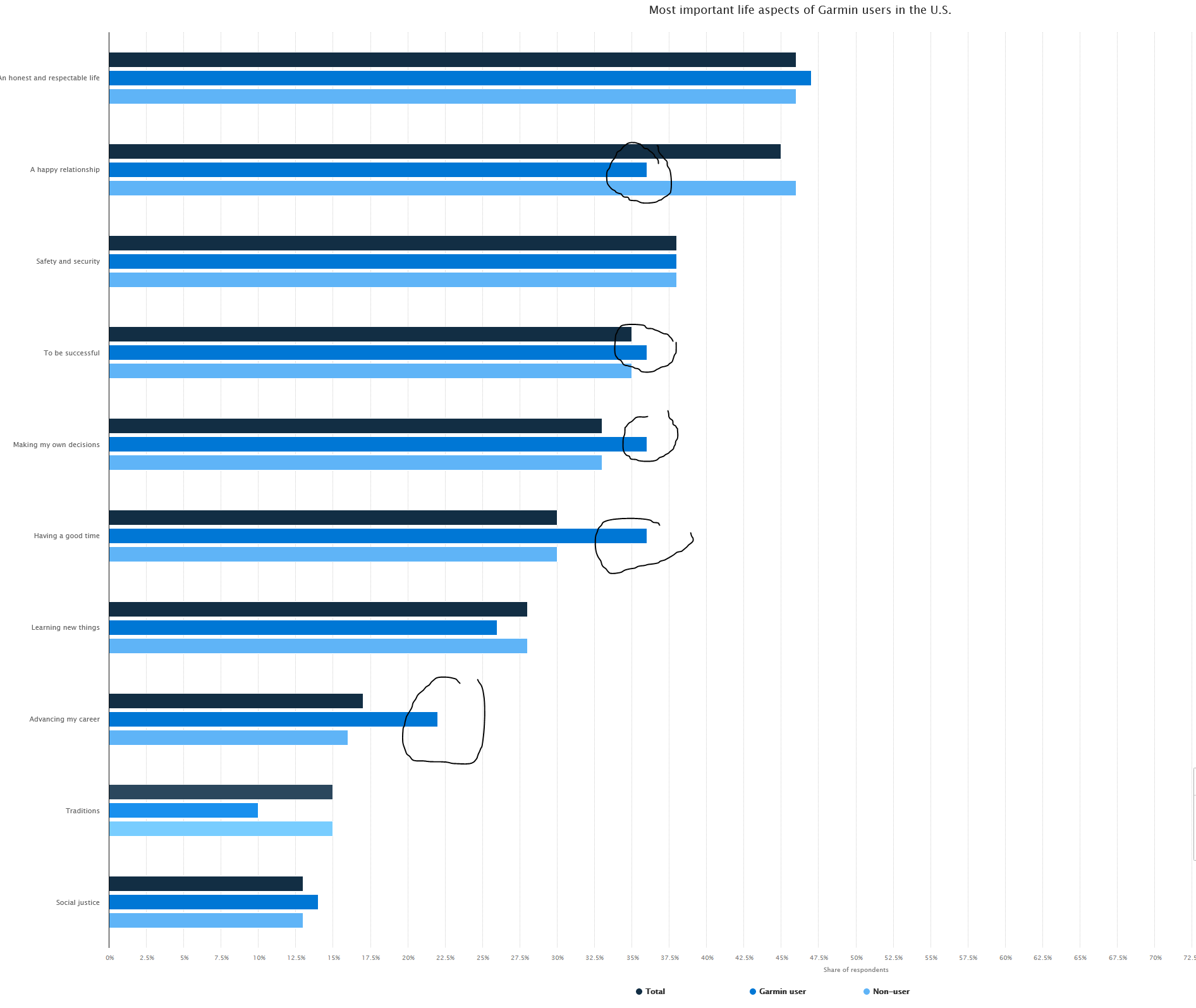 The next insight into Garmin users (us!) suggests that we’re not as bothered about a happy relationship as other people but are disproportionately more interested in advancing our careers. We’re honest, like to make our own decisions, and want to have a good time but are perhaps less than normally bothered about societal traditions.
