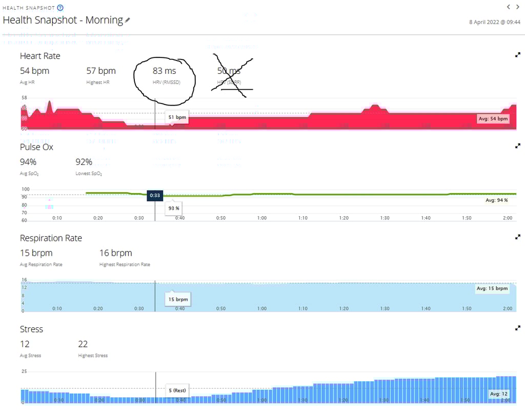If you look at your HRV at a specific point in time, it could be lower because you are stressed or ill, and if you have just exercised, it could be much higher (or lower!) than is the case for you normally. A morning reading or nighttime average is the best period from which to calculate HRV over extended timescales.